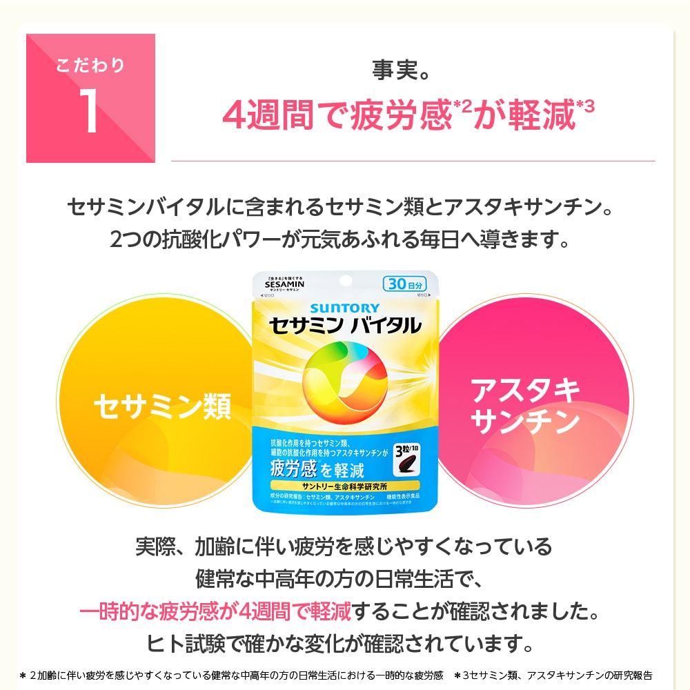 「疲労感が取れない。何だか、まとわりついている」。 そう感じることが増えていませんか。実は、加齢とともに細胞は酸化しサビていきます。つまりあなたのカラダの中で毎日起きている「細胞のサビ」が、疲労感の一因でもあるのです。 セサミンバイタルは、サビを取る成分*1で疲労感*2を軽減する*3機能性表示食品。カラダの抗酸化作用に着目し、疲労感軽減にアプローチします。