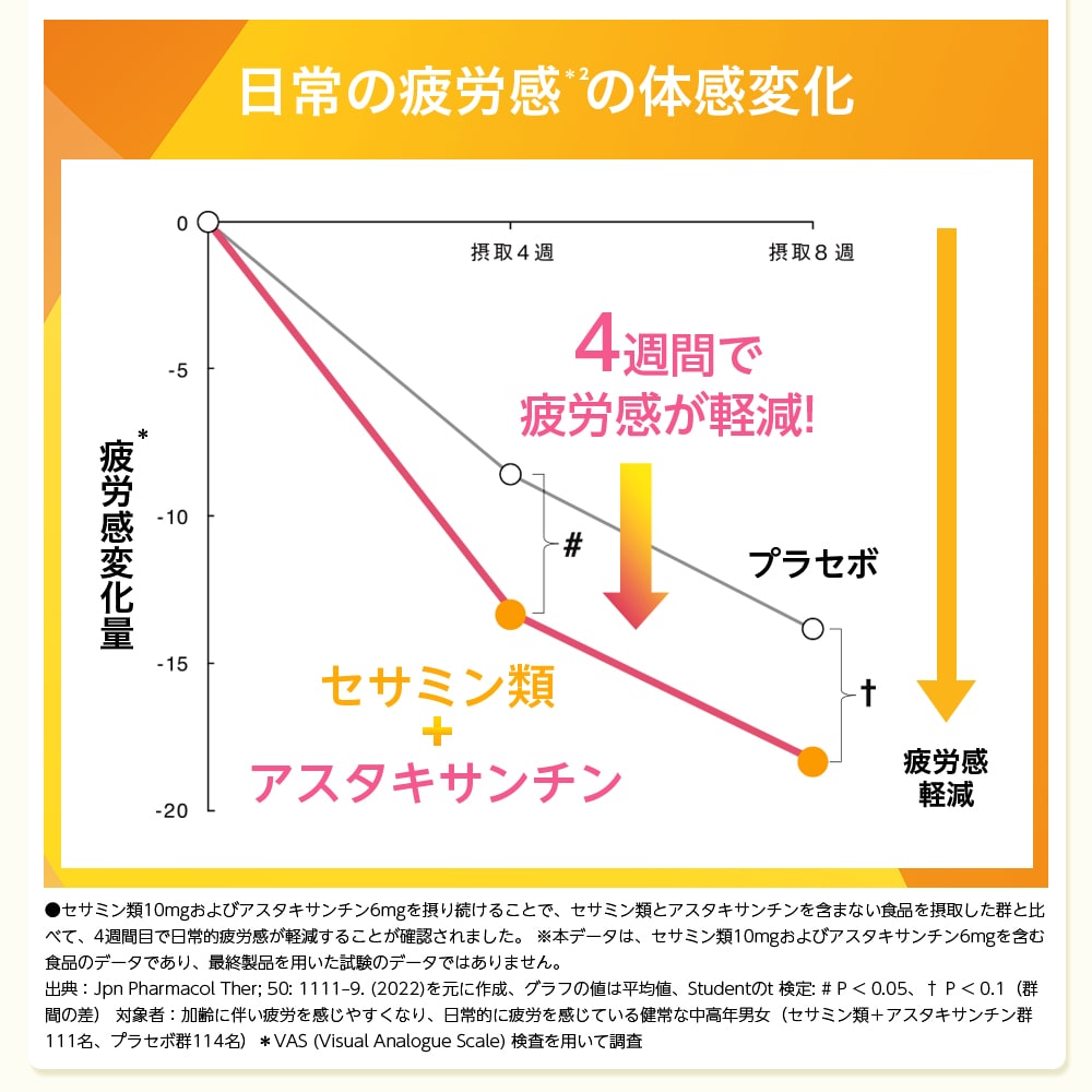 本品には、セサミン類、アスタキサンチンが含まれます。抗酸化作用を持つセサミン類、細胞の抗酸化作用を持つアスタキサンチンには、加齢に伴い疲労を感じやすくなっている健常な中高年の方の日常生活における一時的な疲労感を軽減する機能が報告されています。抗酸化作用を持つセサミン類には、日常生活において疲れを感じている健常な中高年の方の寝覚めという体調を良好に保つ機能があることが報告されています。