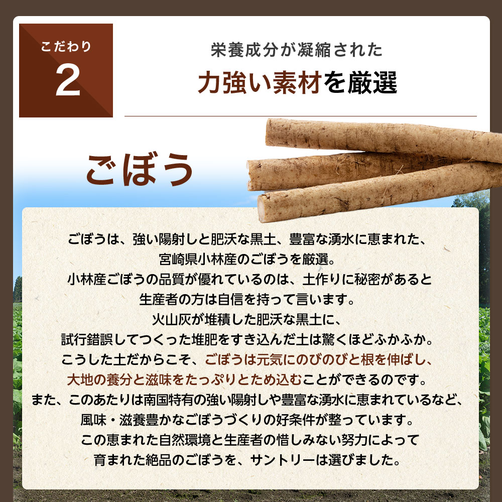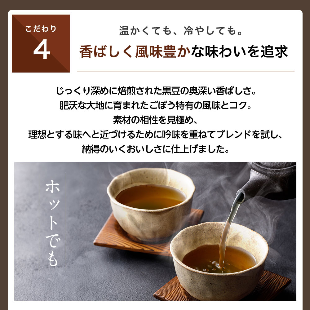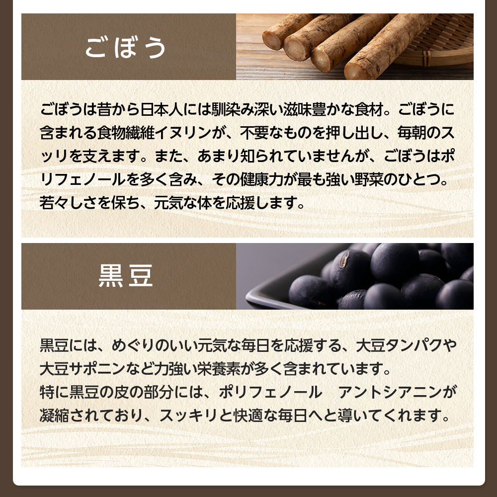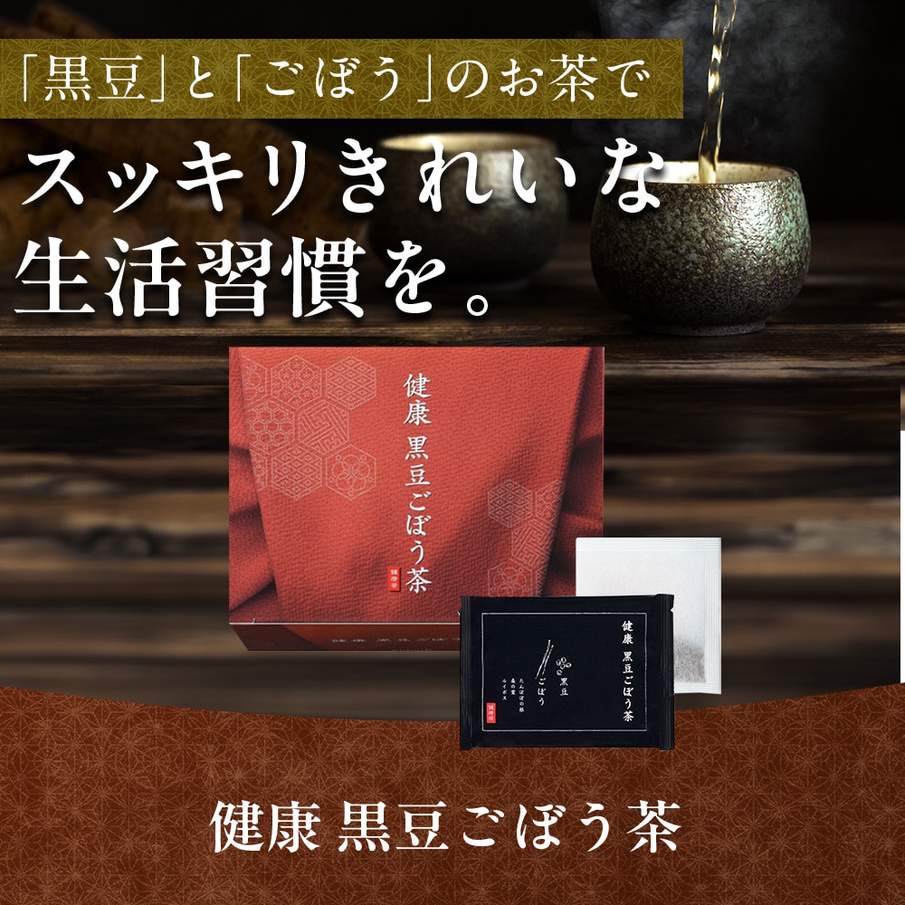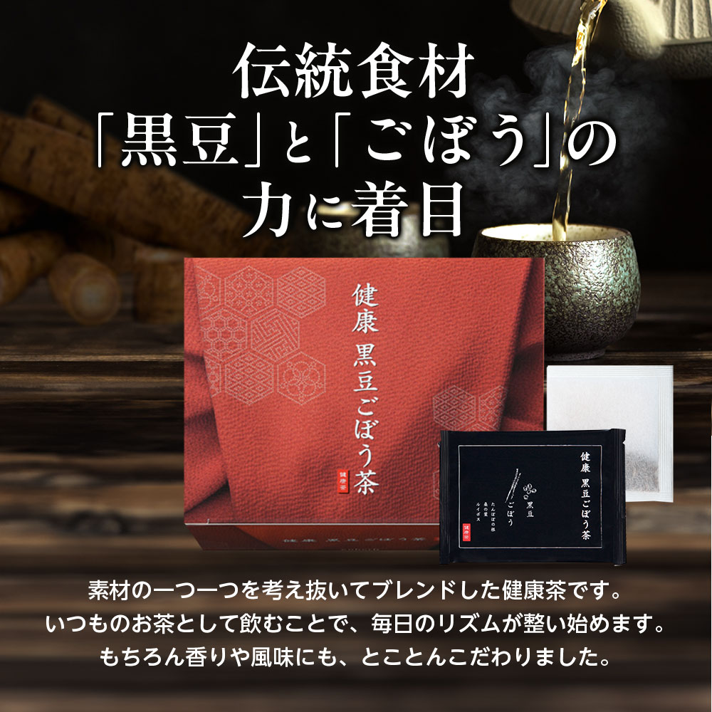 『健康 黒豆ごぼう茶』は、いま話題の伝統食材「黒豆」と「ごぼう」の力に着目し、素材の一つ一つを考え抜いてブレンドした健康茶です。