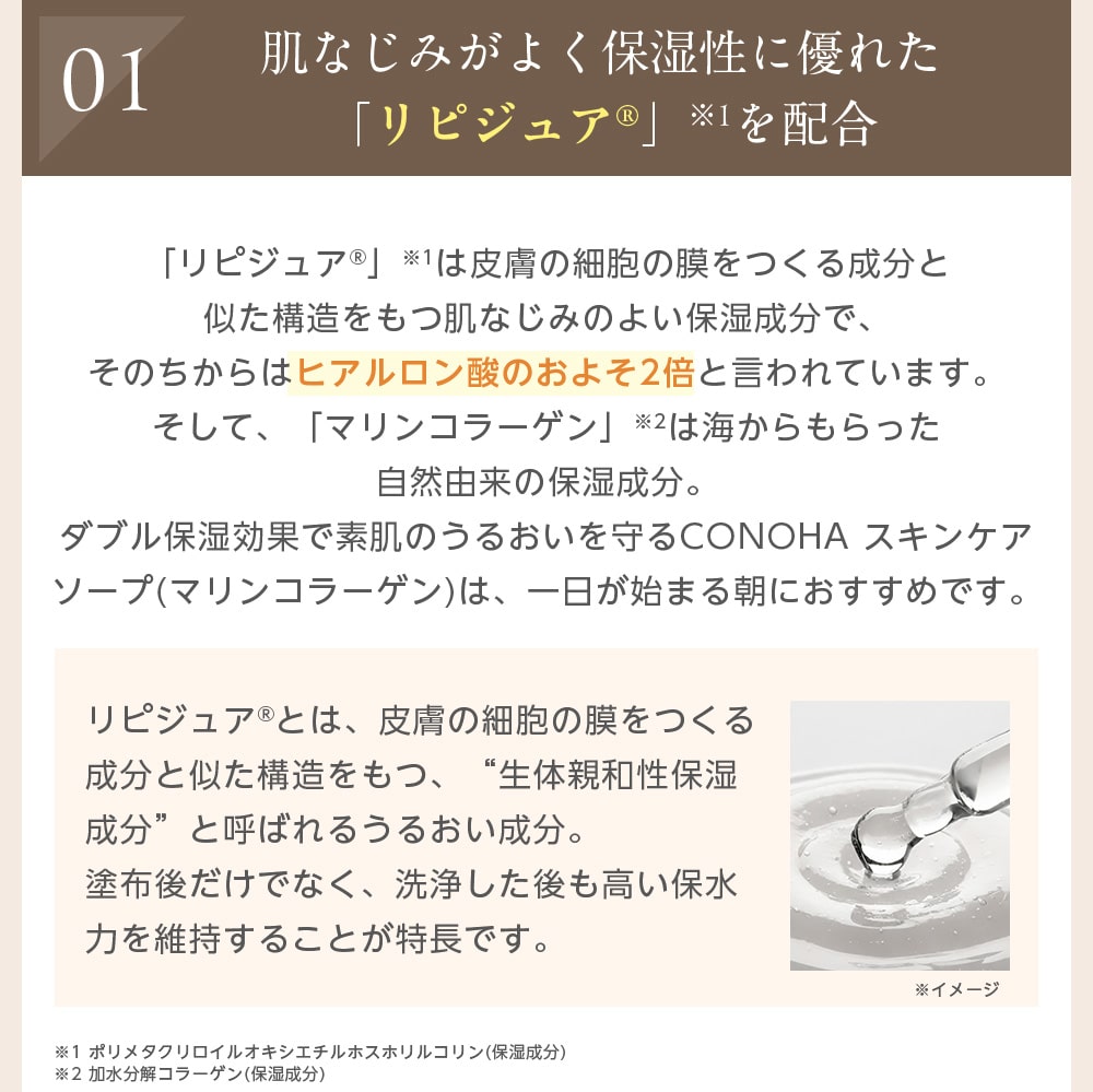 肌なじみがよく保湿性に優れた「リピジュア(R)」(保湿成分)※1に、海のうるおい成分「マリンコラーゲン」※2を配合。