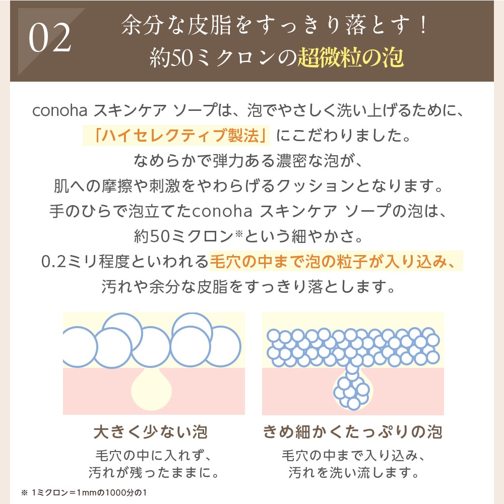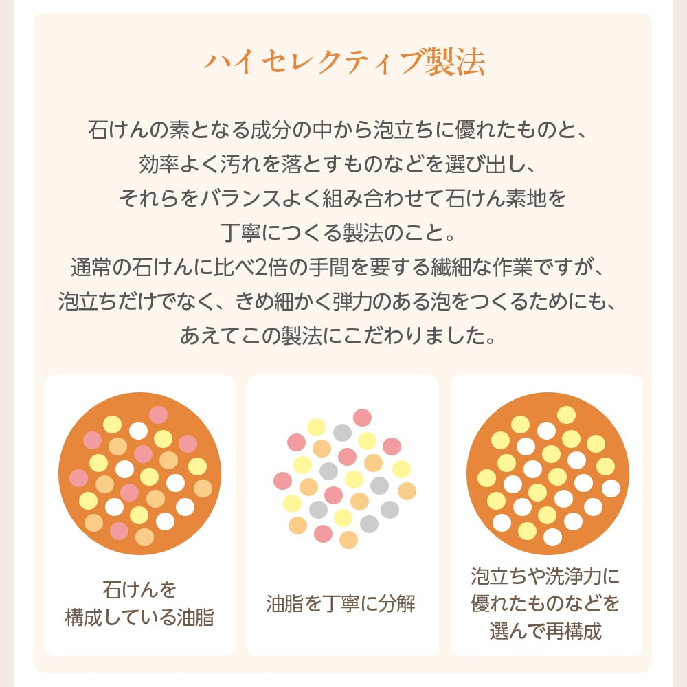 ハイセレクティブ製法による、弾力ある濃密な泡が、睡眠中の新陳代謝による老廃物をすっきり落とします。
