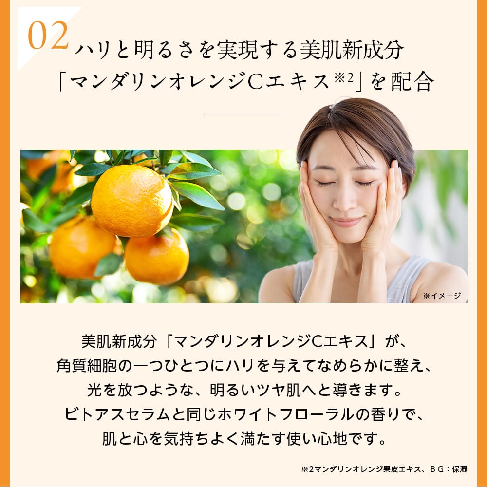 水、トリ(カプリル酸/カプリン酸)グリセリル、グリセリン、BG、ベヘニルアルコール、ミリスチルアルコール、ペンチレングリコール、ジメチコン、ミツロウ、水添ポリイソブテン、アラキジルアルコール、ヘキサ(ヒドロキシステアリン酸/ステアリン酸/ロジン酸)ジペンタエリスリチル、異性化糖、マンダリンオレンジ果皮エキス、スフィンゴ糖脂質、セラミド3、プセウドジマツクバエンシス/(オリーブ油/グリセリン/ダイズタンパク)発酵物、ステアリン酸グリセリル(SE)、バチルアルコール、リンゴ酸ジイソステアリル、アラキジルグルコシド、カルボマー、トコフェロール、キサンタンガム、水酸化Na、クエン酸、クエン酸Na、香料、フェノキシエタノール