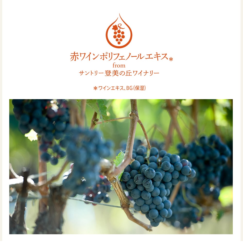 水、BG、スクワラン、エチルヘキサン酸セチル、DPG、ポリソルベート80、グリセリン、セチルPEG/PPG-10/1ジメチコン、エタノール、アセチルヒアルロン酸Na、加水分解ヒアルロン酸、スフィンゴ糖脂質、セラミドAP、セラミドNP、ツバキ種子油、ヒアルロン酸Na、ホホバ種子油、シア脂、マカデミア種子油、ワインエキス、エーデルワイス花/葉エキス、シャクヤク根エキス、オタネニンジン根エキス、加水分解エラスチン、ハマメリス葉エキス、クチナシ果実エキス、マグワ根皮エキス、サッカロミセス/デイリリー花発酵液、ダマスクバラ花エキス、アセロラ果実エキス、加水分解コメエキス、加水分解コラーゲン、加水分解コンキオリン、水溶性プロテオグリカン、セイヨウナシ枝エキス、乳酸桿菌/ハイビスカス花発酵液、マヨラナ葉エキス、メリアアザジラクタ葉エキス、ヒキオコシ葉/茎エキス、ワレモコウエキス、ワイルドタイムエキス、ゲットウ葉エキス、水溶性コラーゲン、ハトムギ種子エキス、硫酸Mg、マイクロクリスタリンワックス、TEA、(アクリル酸Na/アクリロイルジメチルタウリンNa)コポリマー、(アクリレーツ/アクリル酸アルキル(C10-30))クロスポリマー、ヘキサ(ヒドロキシステアリン酸/ステアリン酸/ロジン酸)ジペンタエリスリチル、イソヘキサデカン、オレイン酸ソルビタン、トコフェロール、クエン酸、香料、フェノキシエタノール