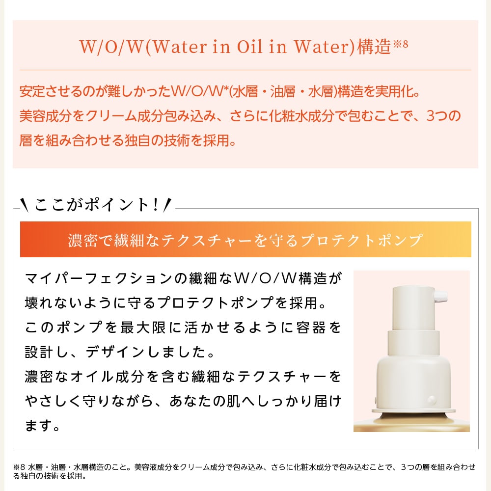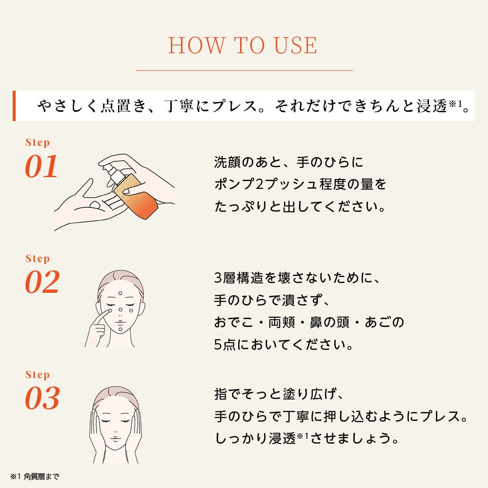 化粧水、美容液、乳液・クリームの役割順に3ステップで肌に浸透※する構造のオールインワン。一度肌に乗せれば、あとは自動的に形状が変化し、3段階で浸透※していきます。