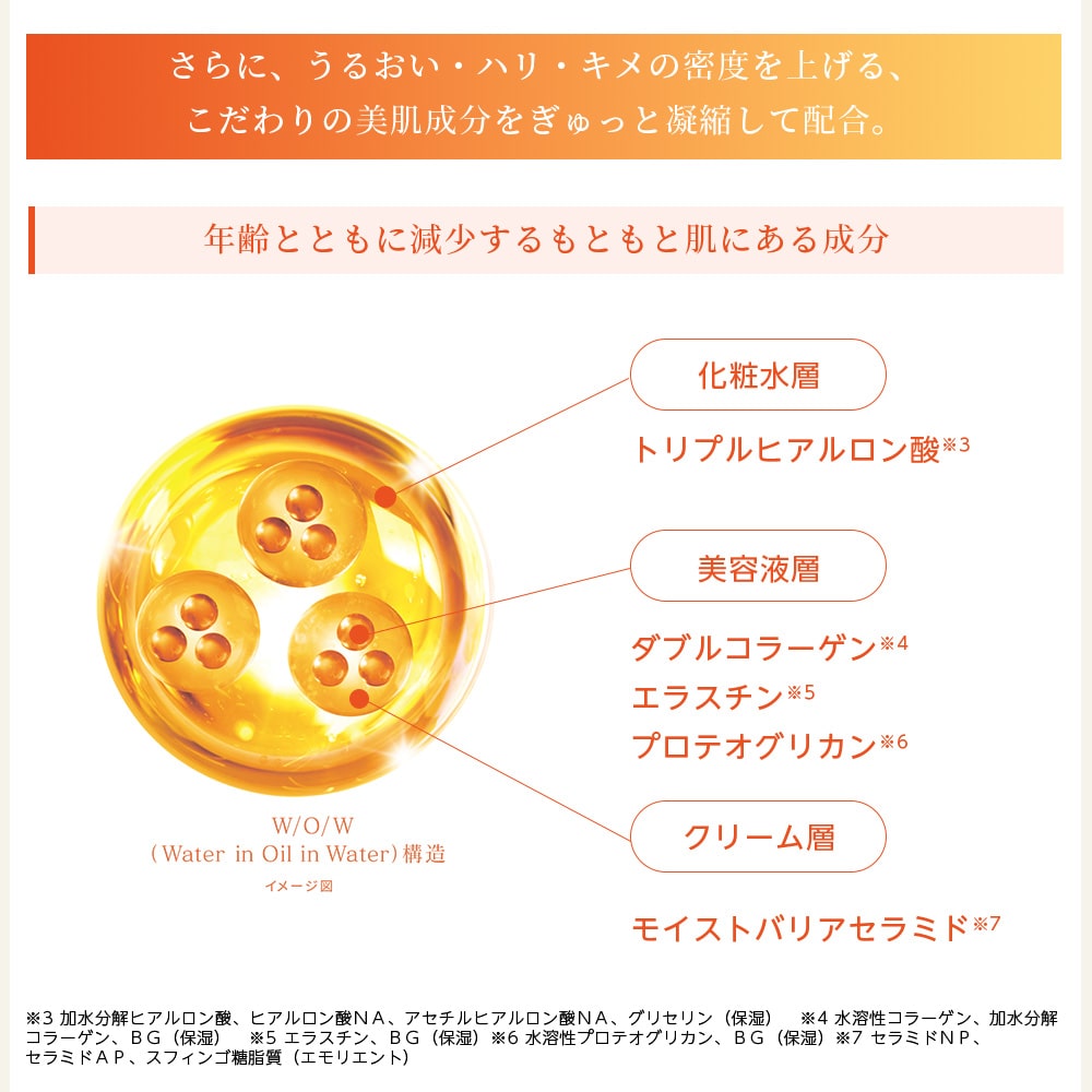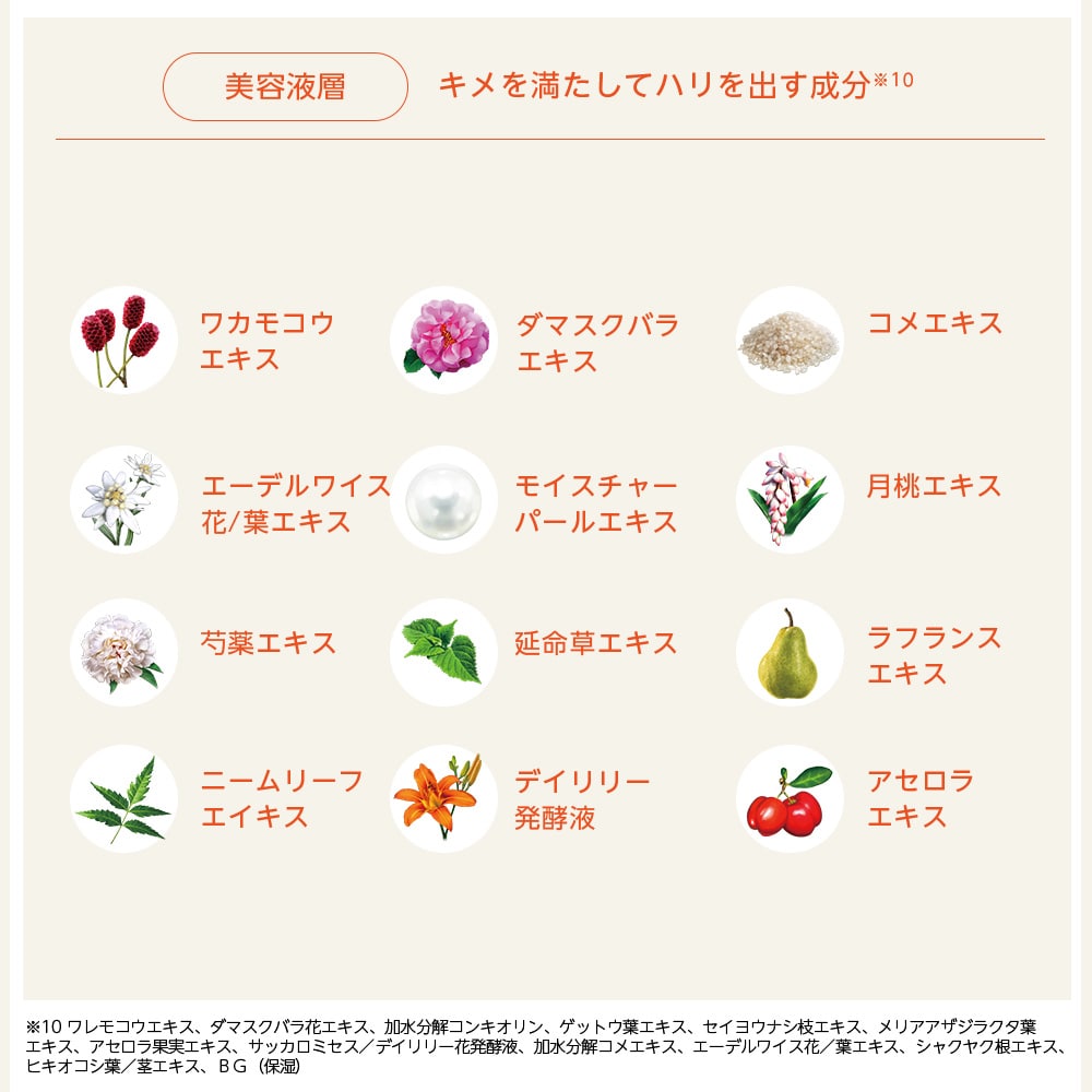 水、BG、スクワラン、グリセリン、エチルヘキサン酸セチル、DPG、ポリソルベート80、セチルPEG/PPG-10/1ジメチコン、エタノール、アセチルヒアルロン酸Na、加水分解ヒアルロン酸、スフィンゴ糖脂質、セラミドAP、セラミドNP、ツバキ種子油、ヒアルロン酸Na、ホホバ種子油、シア脂、マカデミア種子油、ワインエキス、エーデルワイス花/葉エキス、シャクヤク根エキス、オタネニンジン根エキス、加水分解エラスチン、ハマメリス葉エキス、クチナシ果実エキス、マグワ根皮エキス、サッカロミセス/デイリリー花発酵液、ダマスクバラ花エキス、アセロラ果実エキス、加水分解コメエキス、加水分解コラーゲン、加水分解コンキオリン、水溶性プロテオグリカン、セイヨウナシ枝エキス、乳酸桿菌/ハイビスカス花発酵液、マヨラナ葉エキス、メリアアザジラクタ葉エキス、ヒキオコシ葉/茎エキス、ワレモコウエキス、ワイルドタイムエキス、ゲットウ葉エキス、水溶性コラーゲン、ハトムギ種子エキス、ベタイン、ポリグリセリン-3、硫酸Mg、マイクロクリスタリンワックス、ジグリセリン、TEA、(アクリル酸Na/アクリロイルジメチルタウリンNa)コポリマー、(アクリレーツ/アクリル酸アルキル(C10-30))クロスポリマー、ヘキサ(ヒドロキシステアリン酸/ステアリン酸/ロジン酸)ジペンタエリスリチル、イソヘキサデカン、オレイン酸ソルビタン、トコフェロール、クエン酸、香料、フェノキシエタノール