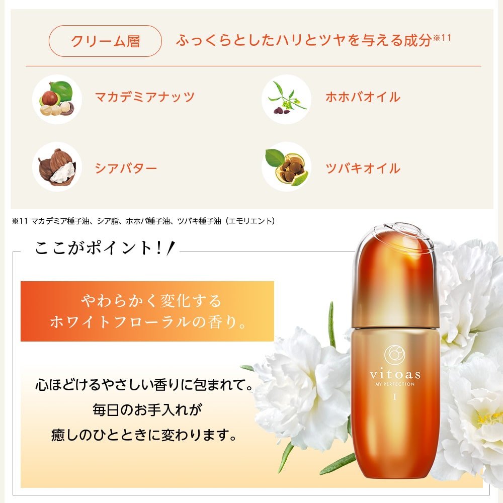 ハリを与える成分がたっぷり配合されているので、決して手抜きではない、手間暇かけたワンランク上の肌に。