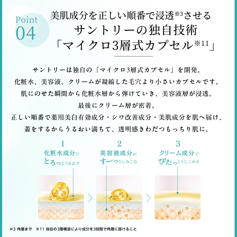 化粧水、美容液、クリームを凝縮した独自の「3層式カプセル」が肌に弾けてうるおし、密着。
