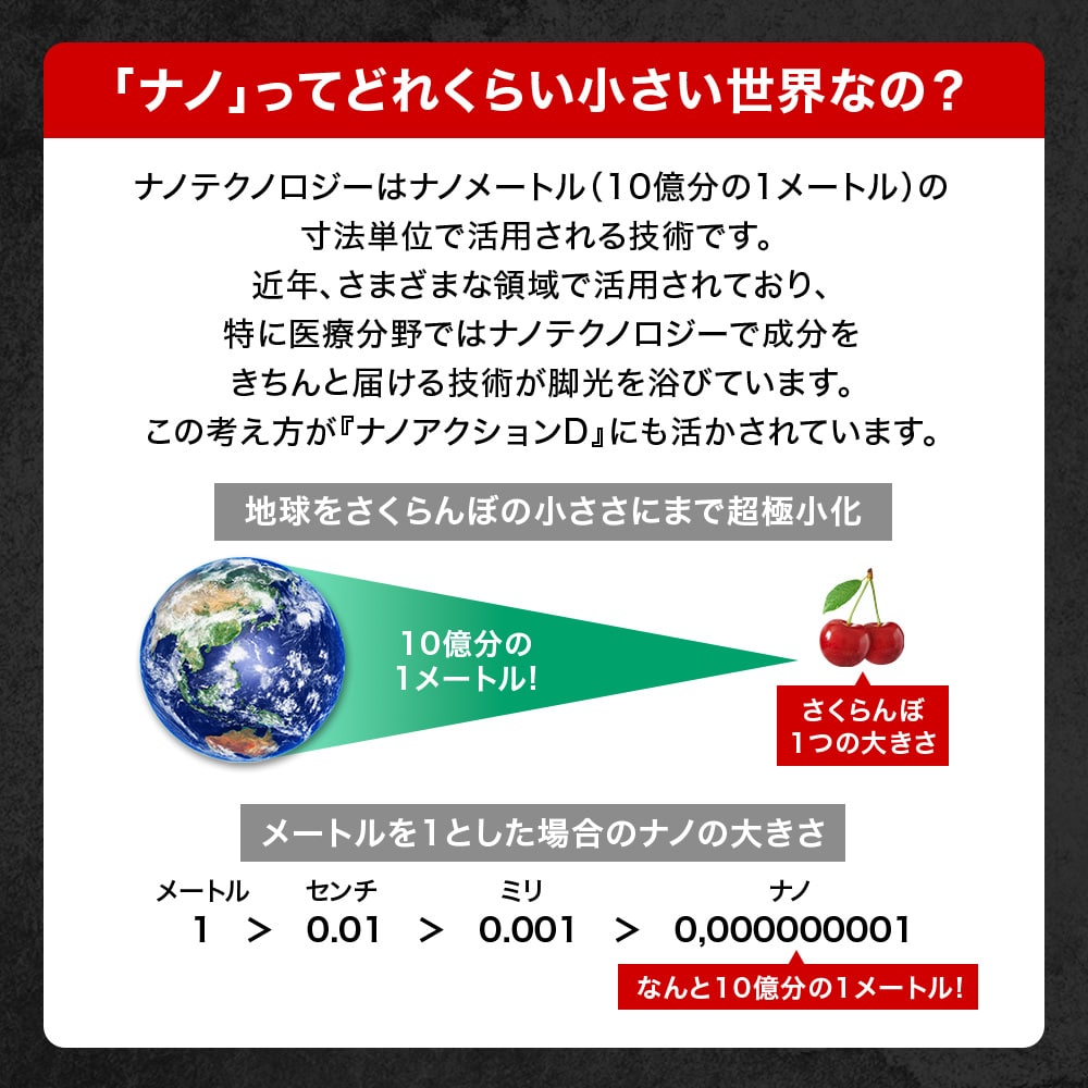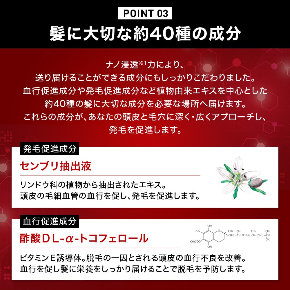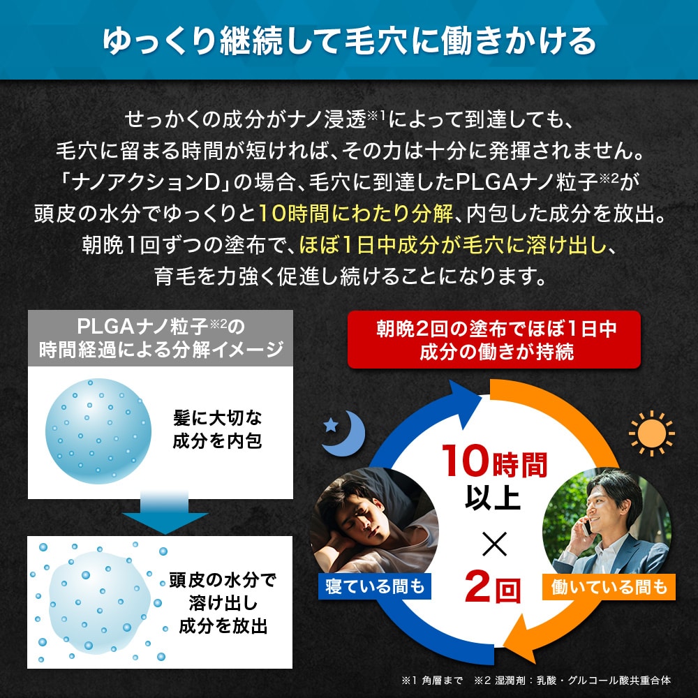 『ナノアクションD』は先進のナノテクノロジーにより、髪に有効な成分を必要な場所へと送り届けることを可能にしました。