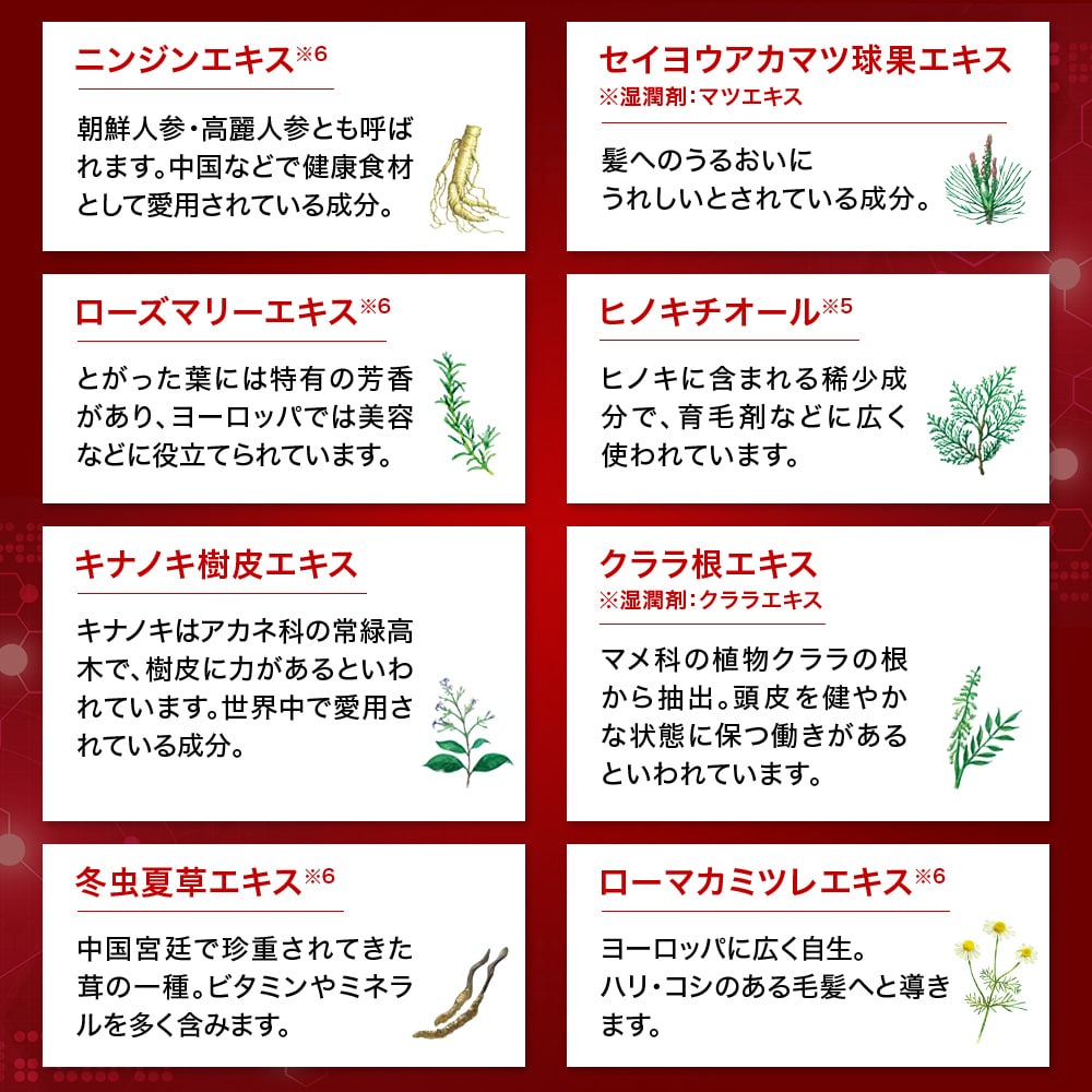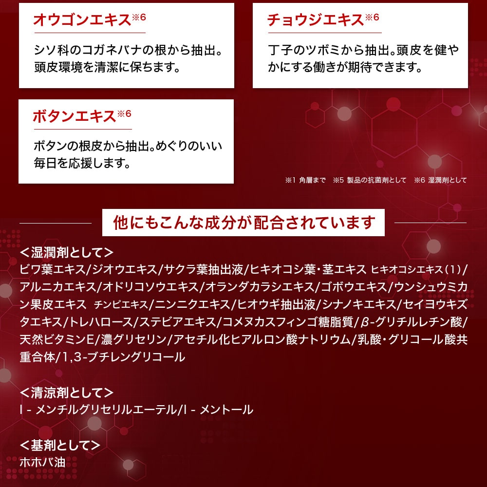 その他の成分;1,3-ブチレングリコール、ポリオキシエチレンポリオキシプロピレンデシルテトラデシルエーテル、ヒノキチオール、l-メンチルグリセリルエーテル、エタノール、ビワ葉エキス、ジオウエキス、サクラ葉抽出液、ヒオウギ抽出液、キナエキス、クララエキス(1)、チョウジエキス、アルニカエキス、オドリコソウエキス、オランダカラシエキス、ゴボウエキス、セイヨウキズタエキス、ニンニクエキス、マツエキス、ローズマリーエキス、ローマカミツレエキス、オウゴンエキス、ニンジンエキス、チンピエキス、ボタンエキス、シナノキエキス、ヒキオコシエキス(1)、冬虫夏草エキス、l-メントール、キサンタンガム、アセチル化ヒアルロン酸ナトリウム、トレハロース、乳酸・グリコール酸共重合体、ポリビニルアルコール、ステビアエキス、コメヌカスフィンゴ糖脂質、N-ステアロイルジヒドロスフィンゴシン、β-グリチルレチン酸、天然ビタミンE、ホホバ油、濃グリセリン、モノミリスチン酸デカグリセリル、N-ステアロイル-L-グルタミン酸ナトリウム、リン酸一水素ナトリウム、クエン酸、精製水、無水エタノール、d-δ-トコフェロール