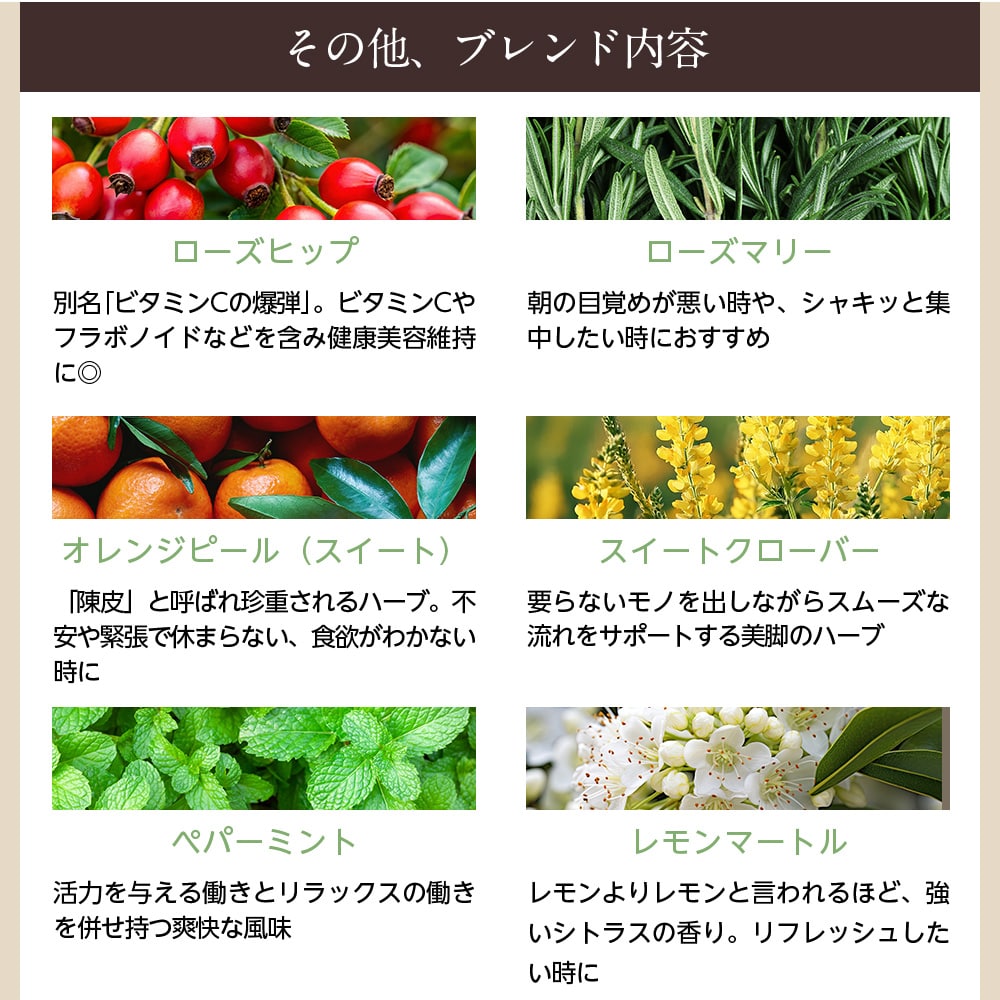 レモングラス、ローズヒップ、ローズマリー、オレンジピール(スイート)、スイートクローバー、ペパーミント、マテ、レモンマートル