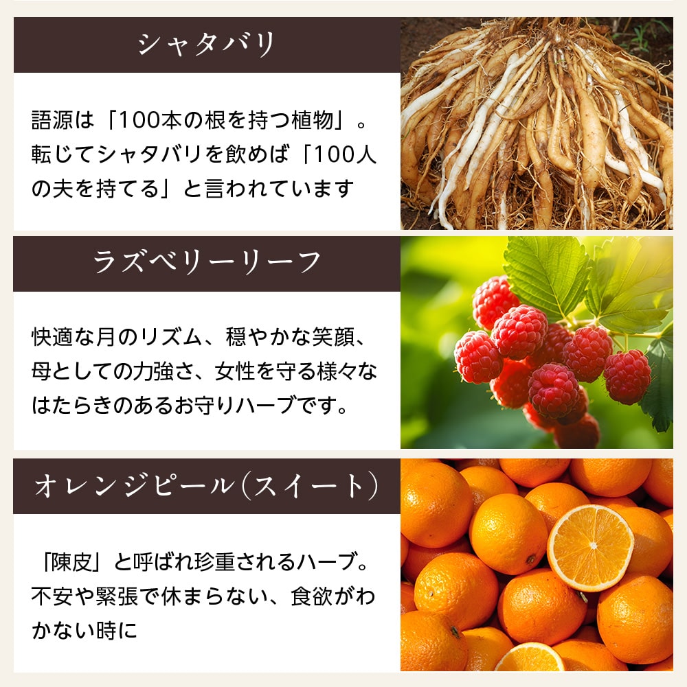 オレンジピール(スイート)、ラズベリーリーフ、レモンマートル、ジンジャー、ターメリック、ジャーマンカモミール、シャタバリ、スカルキャップ、レッドクローバー