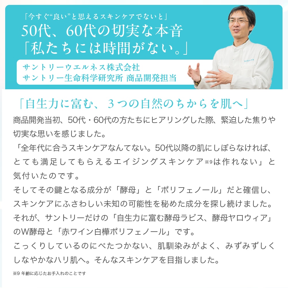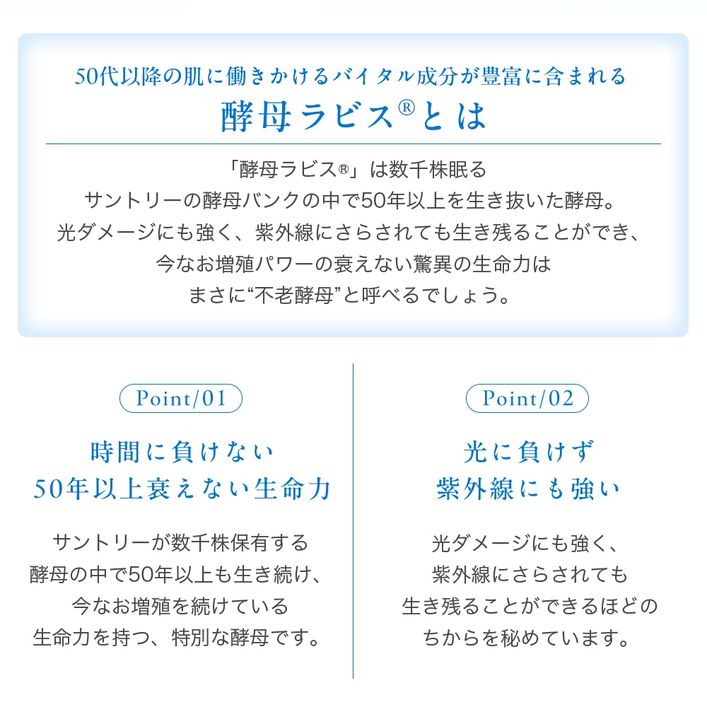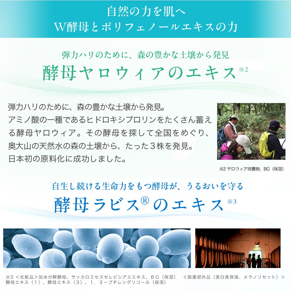 弾力のあるハリが失われた肌のために。酵母ラビス(R)のエキス※1に加え、赤ワイン白樺ポリフェノール※2や酵母ヤロウィアのエキス※3など先進の研究成果が生んだ成分を凝縮。弾力ハリ成分がハリを与え、弾むようなふっくら肌へと導きます。