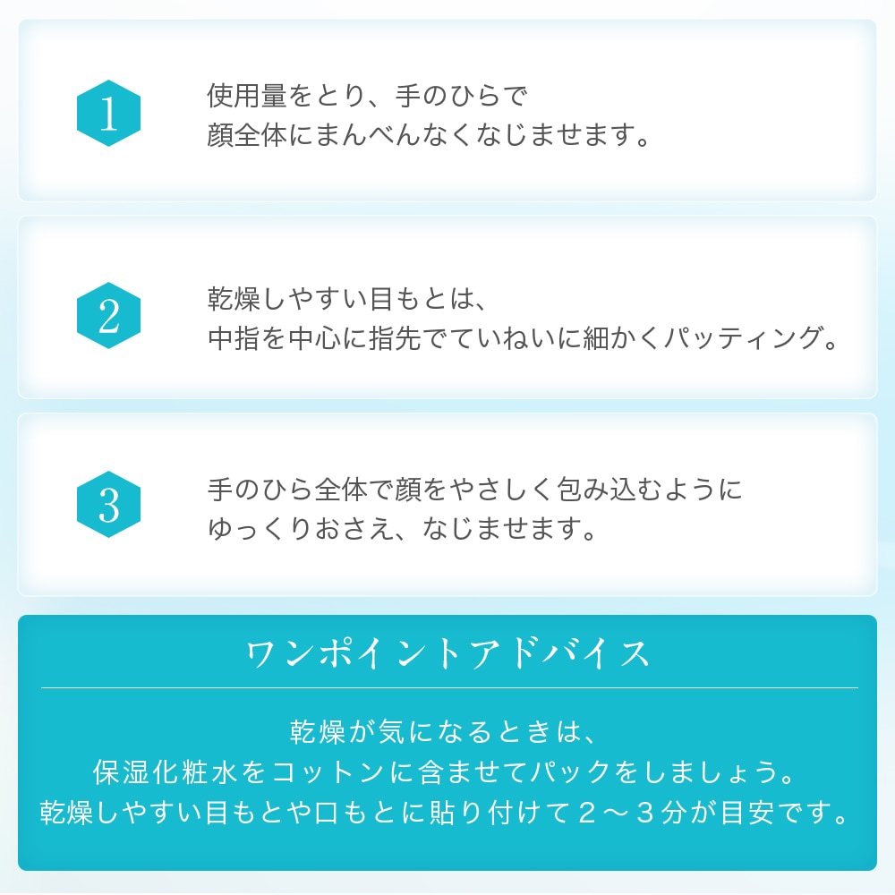 [ご使用方法]化粧水の後、顔全体になじませてください。