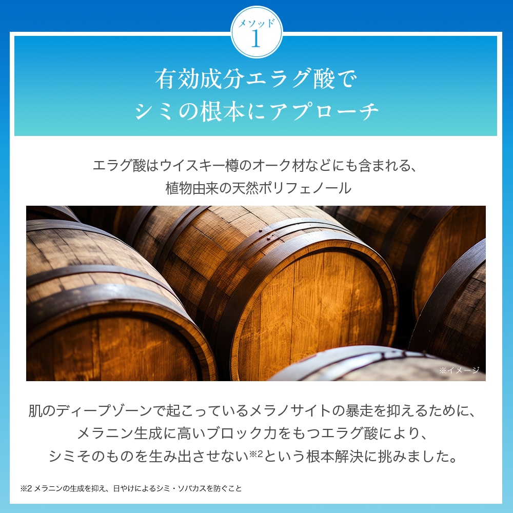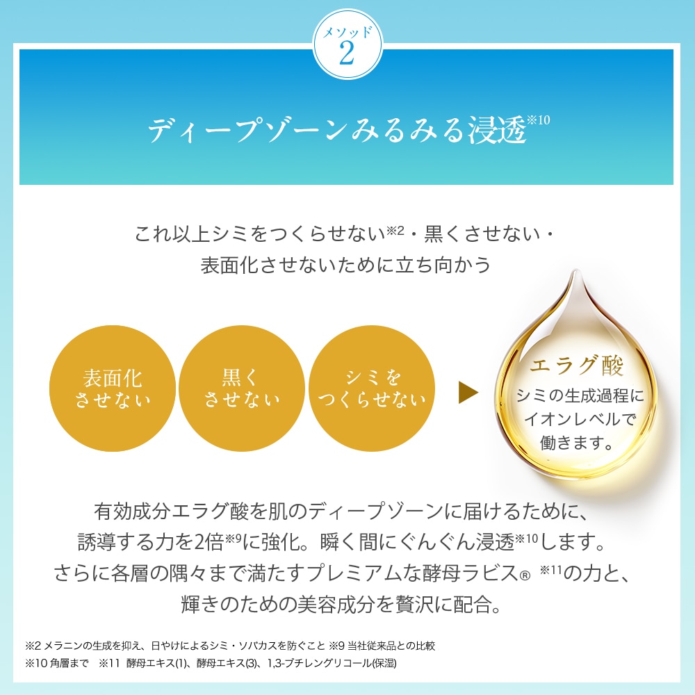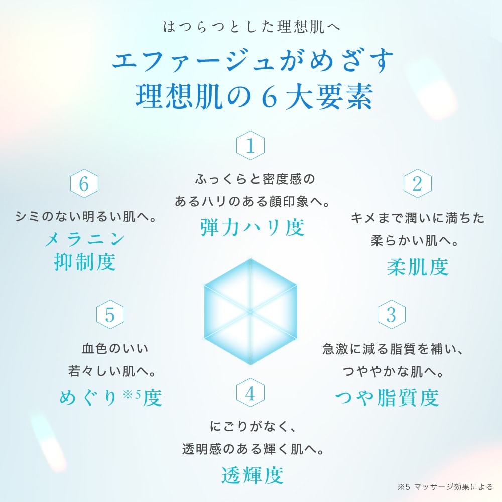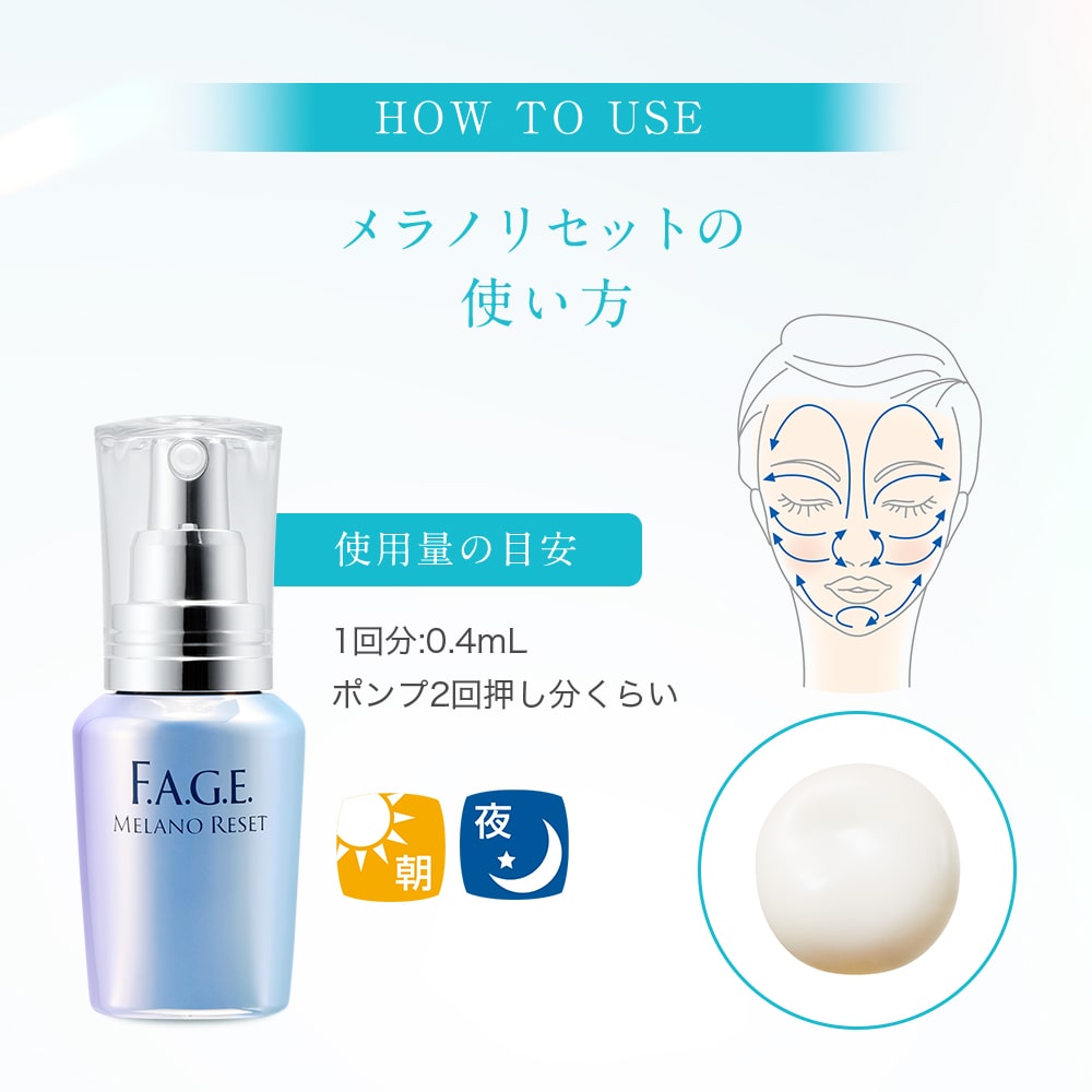 60代以降の肌に、突然浮き出てくるシミは、なかなか消えてくれません。じつは、シミの発生源であるディープゾーンでは、過去に浴びた大量の紫外線などのせいで、メラノサイトが暴走。シミのもとであるメラニンが続々とつくり出されてしまう状態にあります。『メラノリセット』は、年齢肌※3のために考え抜かれたスキンケアシリーズ「エファージュ」のスペシャルケアです。