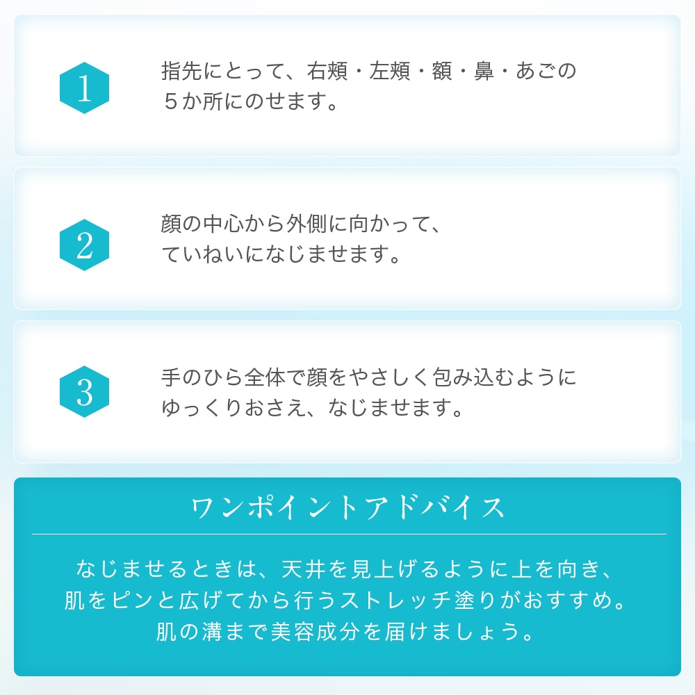 [ご使用方法]化粧水の後、顔全体になじませてください。