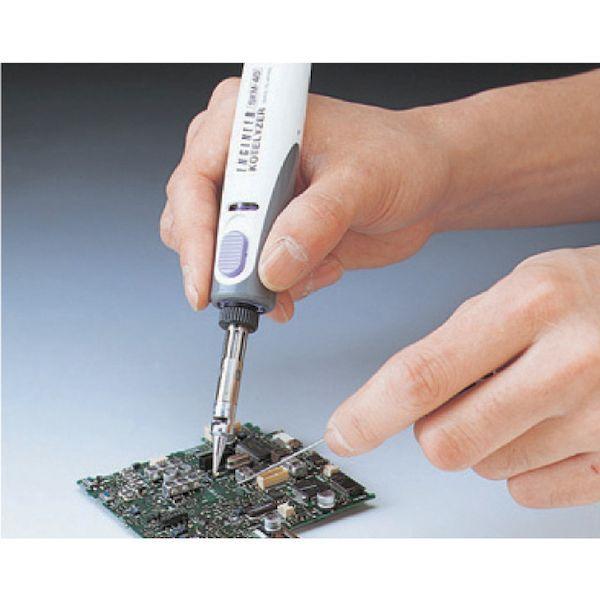 エンジニアメーカーお問い合わせ:06-6974-0028【特長】●電源不要のコードレスはんだこて、電圧の異なる外国でも使用できます。●着火後約30秒で作業OK、20W~60W相当のパワー調整が可能です。●ガストーチ、ホットブローとしても使用できます。●1回のガス充填で連続約1時間使えます。【用途】●電源などがない所や屋外での作業などに。【仕様】●ガス充填量(ml):12●連続使用時間:60分●付属コテ先:SK-42●設定温度(℃):500(ホットブロー時650℃、トーチ時1300℃)●全長(mm):186【仕様2】●方式:ガス触媒発熱方式(ライター着火式)●本体重量(g):74●約1時間(レバー中央位置)【材質/仕上】●コテ先:銅(鉄・クロムメッキ)、グリップ:ナイロン【セット内容/付属品】●保護キャップ●クリーナー付コテ台●ホットブローチップ(SK-46)●糸はんだ【原産国】日本