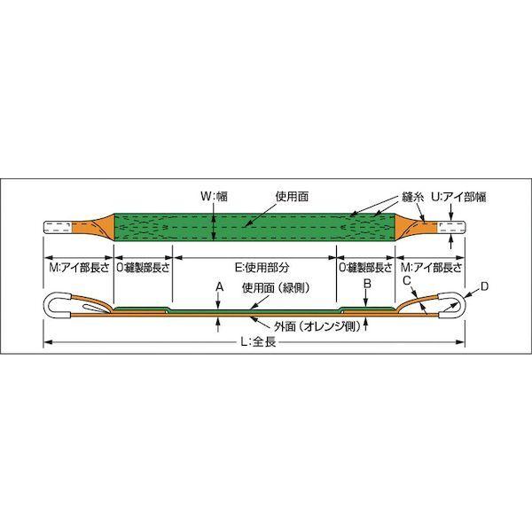 【特長】●適度な伸びが衝撃を柔らげます。●グリーン面(使用面)とオレンジ面(外面)が色分けされています。(ベルトスリングの構造上、グリーン面(使用面)とオレンジ面(外面)では耐久性が異なりますので、グリーン面(使用面)で正しく使用してください。)【用途】●鋼材:メッキ・塗装などの表面加工鋼材・鋼管・鋼板などの運搬。●機械:自動車および自動車部品・精密機械の運搬。【仕様】●最大使用荷重(t):1.6●全長(m):6.0●ベルト寸法(mm)幅×厚さ:50×8【仕様2】●JIS B 8818規格品●使用温度:100℃以下●両端アイ形【材質/仕上】●ナイロン(内部:ポリエステル)【注意】●使用可能温度100℃以下●耐化学薬品用では、ありません。●繊維製品ですので寸法に多少の誤差があります。2本組などで厳密な長さ揃えが必要な場合には事前にご相談ください。●荷物の鋭利な角や摩擦によってベルトスリングなどの繊維スリングを傷つける恐れがある箇所には、必ずコーナーパッドなどの当て物を使用してください。●当て物を使用していても荷物の横滑りや周囲の壁や物への接触、加圧などによりスリングが損傷および切断する可能性がありますので作業環境には十分に注意してご使用ください。【原産国】日本