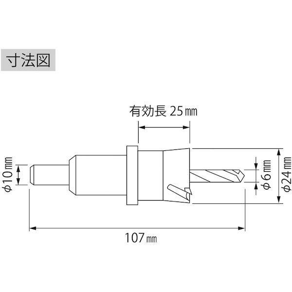 ロブテックスメーカーお問い合わせ:072-980-1111【特長】●ドリルと本体のチタンダブルコーティングです。●深孔を可能にした切り粉排出機構です。(0.3~25mmの深孔可能、ステンレスは6mm以下)●切りくず4分割でスムーズな切削ができます。●切りくず排出用スプリングを標準装備です。【用途】●被削材:ステンレス(6mm以下)、鋼板、銅などの金属系材(板およびパイプ)、木材、合板、合成樹脂などの木材系、石こうボード、人造大理石など軟質系窯業材。【仕様】●刃径(mm):24●ふところ深さ(mm):25●シャンク径(mm):10●刃厚(mm):3●適合機種:電気ドリル●有効切削能力(mm):25(ステンレスは6mm)●表面処理:チタンコーティング●刃数(枚):6●有効長(mm)【仕様2】●シャンク形状:三面取(ストレート)【材質/仕上】●刃部:超硬チップ●センタードリル:コバルト高速度鋼【原産国】日本