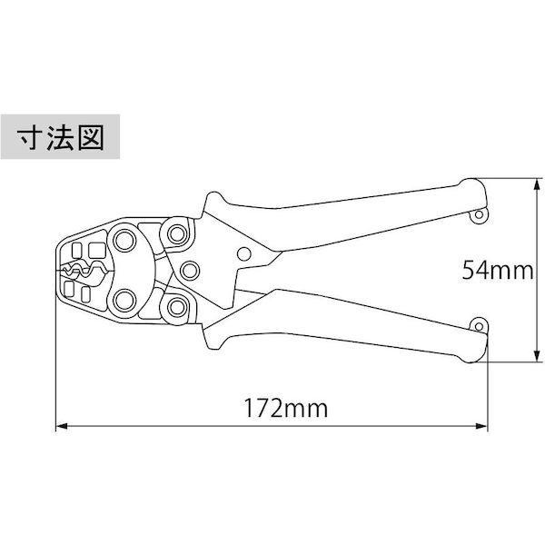 ロブテックスメーカーお問い合わせ:072-980-1111【特長】●柄の開きが139mmと小さく、簡単に圧着作業ができます。●小柄なボディでパワフル圧着できます。●軽量&コンパクト設計で手にソフトにフィットするポケットサイズです。【用途】●裸端子やスリーブを用いて電線を圧着・接続に。●銅線用裸圧着端子用●銅線用裸圧着スリーブ(P、B)用【仕様】●全長(mm):172●圧着端子([[MM2]])裸端子用:0.3、0.5、1.25、2、3.5、5.5【材質/仕上】●本体:スチール●グリップ:樹脂【原産国】日本