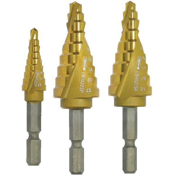 ロブテックスメーカーお問い合わせ:072-980-1111【特長】●スパイラル溝の採用によりスクイ角が鋭角なため、従来品より大幅に切れ味が向上しました。●刃には特殊加工および独自の研磨が施されていますので、作業時の抵抗が少なく、切れ味・切り粉の排出に優れています。●穴あけ、下穴拡大、修正・面取り、3本で様々な径に対応します。●薄鉄板、木ねじの下穴、パイプなどの曲面など、様々な用途・材料に対応します。●ドリルは横滑りが少なく、被削材への食い付きが抜群で、センターポンチが不要です。【用途】●被削材:鉄板、木材、プラスチック、ステンレスなど。(熱処理された金属板には使用しないでください。)【仕様】●段幅(mm):4.0●段数(段):9●シャンク径(mm):6.35●表面処理:チタンコーティング●穴あけ寸法(φ):6、8、10、12、14、16、18、20、22【材質/仕上】●コバルトハイス【セット内容/付属品】●なし【原産国】日本