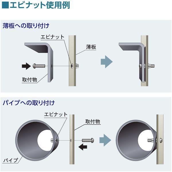 ロブテックスメーカーお問い合わせ:072-980-1111【特長】●エビナットはナットとリベットの機能を兼ね備えたブラインドファスナーです。●タップ立ての難しい薄材やパイプ・溶接のできないプラスチック板にも片側から簡単に取り付けることができます。●専用のエビ印ナッターを使用すれば、カシメ板厚に応じた適切なストローク調整ができ、均一な仕上がりとなります。●タップ立ての難しい薄板やパイプ、角パイプ、溶接のできないプラスチック板にも、片側からワンアクションで簡単に、仕上がりも美しく取り付けられます。●専用のエビ印エアーナッター、電気ナッター、ハンドナッターを使えば誰でも確実に取り付けることができ、コストダウン及び作業の省力化に大きな威力を発揮します。【用途】●車の鋼板部、樹脂部(パーツなど)へのパーツ取り付けに。●エクステリアなどアルミ建材へのパーツ取り付けに。●薄板にアクセサリーの取付け、パイプと平板の接続、農具・器具の水平出し等に【仕様】●かしめ板厚(mm):1.0~3.2●下穴径(mm):7.1●適用ねじ:M5×0.80●ナット外径(mm):7●全長(mm):13.0●フランジ厚さ(mm):1.0【仕様2】●平頭●箱入【材質/仕上】●スチール(SWCH)【原産国】日本