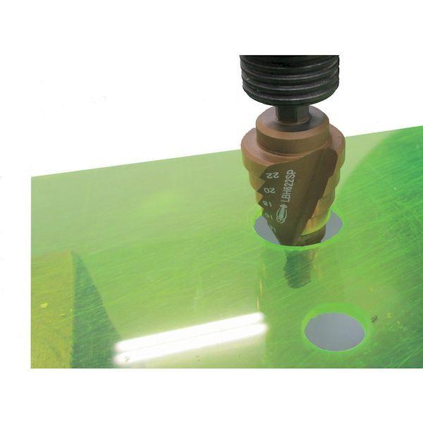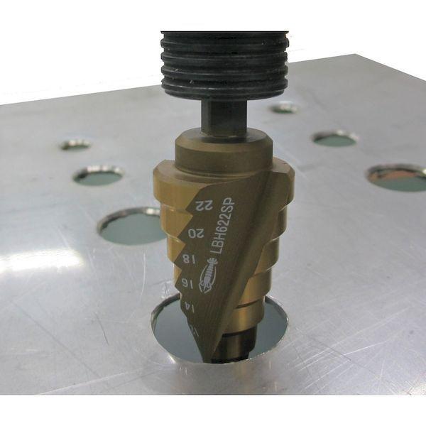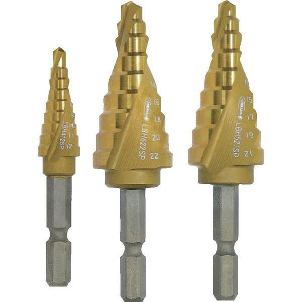 ロブテックスメーカーお問い合わせ:072-980-1111【特長】●スパイラル溝の採用によりスクイ角が鋭角なため、従来品より大幅に切れ味が向上しました。●刃には特殊加工および独自の研磨が施されていますので、作業時の抵抗が少なく、切れ味・切り粉の排出に優れています。●穴あけ、下穴拡大、修正・面取り、2本で様々な径に対応します。●薄鉄板、木ねじの下穴、パイプなどの曲面など、様々な用途・材料に対応します。●ドリルは横滑りが少なく、被削材への食い付きが抜群で、センターポンチが不要です。【用途】●被削材:鉄板、木材、プラスチック、ステンレスなど。(熱処理された金属板には使用しないでください。)【仕様】●段幅(mm):4.0●段数(段):9●シャンク径(mm):6.35●表面処理:チタンコーティング●穴あけ寸法(φ):5、7、9、11、13、15、17、19、21【材質/仕上】●コバルトハイス【セット内容/付属品】●なし【原産国】日本