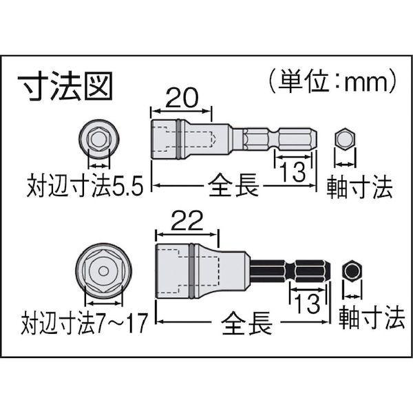 ベッセルメーカーお問い合わせ:0120-999-914【特長】●配管・配線支持金具取り付け他、六角ボルトナット締め付けに適しています。●特許・軸部圧入式構造でガタつき、軸抜けがありません。●面接触型6角ソケットです。●軸部とソケット部をそれぞれ最適な硬度で熱処理しているのでねじれに強い特性があります。【用途】●配管・配線支持金具取り付け他、六角ボルトナット締め付けに。【仕様】●軸寸法(mm):6.35●全長(mm):60●対辺寸法(mm):10【仕様2】●18Vインパクト対応【材質/仕上】●クロムバナジウム鋼(Cr-V)【原産国】日本