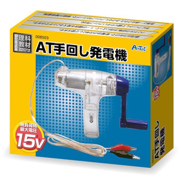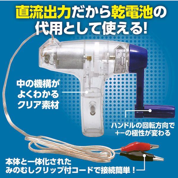 ●商品はイメージです(※工作例の場合があります)運動を利用して発電することを体感できる!AT手回し発電機の特長・最大出力電圧15Vの手回し発電機です。・極性はハンドルの回転方向で変化します。・コードは本体と一体化されているため接続ミスがありません。・みの虫クリップ付で簡単に接続できます。 ・グリップは握りやすい形状になっています。出力/最大出力電圧(無負荷時)15V 最大出力電流(短絡時)1.5A (ハンドルの回転速度により変化)、コード/1m みのむしクリップ付¥n本体:152×110×40mm、コード:1m みの虫クリップ付本体:透明ポリカーボネー