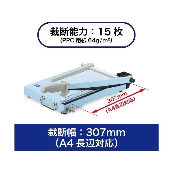 ●円弧状の強力刃によりラクラク裁断できます。指が刃に当たらない安全設計です。持ち運びに便利な手提げ金具付です。使用しない時や持ち運ぶ際に刃が開かず安全です(ハンドルロック付)。横ガイドの目盛に縦ガイドをセットすると指定の寸法に裁断できます(マグネット付でしっかり固定)。●裁断能力(PPC用紙64g/m2):15枚●裁断幅:307mm(A4版)●テーブルサイズ:W256XD350mm●テーブル:鉄板●2,500gmm