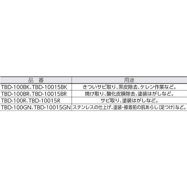 【特長】●傘型の特殊形状に加工されているため、常にディスクの先端がワークにあたり、美しい仕上げができます。●柔軟性が高く、凹凸面にもよく馴染み、ワークを削りすぎません。●目づまりが少なく、ナイロンの溶着がありません。●ワイヤブラシのようにワイヤ飛散の心配等がなく安全に使用できます。●取付穴径が15mmなので電動式、エア式両方のグラインダーで使用できます。●芯ブレが少なく作業者にやさしい設計です。【用途】●サビ取り、塗装はがしなど。【仕様】●粒度(#):320相当●外径(mm):95●厚さ(mm):11●穴径(mm):15●最高使用回転数(rpm):12000●色:レッド●質量:240【仕様2】●最高使用周速度:59.7m/s(3580m/min)●使用工具:100mmディスクグラインダー(電動・エア兼用)【材質/仕上】●ナイロン不織布【原産国】日本