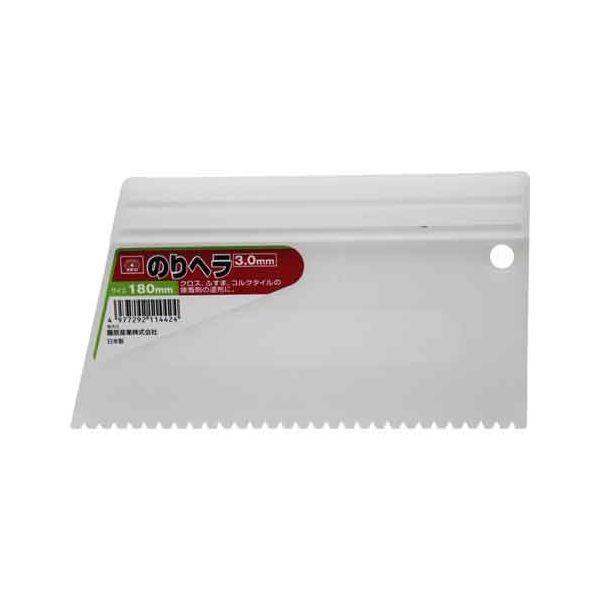 【用途】クロス及び化学センイ等の壁・ふすま・コルクタイルの接着作業。【機能・特徴】接着剤の塗布に適しています。【仕様】●サイズ:180mm。●溝:3.0mm。●ポリプロピレン。大工道具 内装ツール 塗りつけヘラ