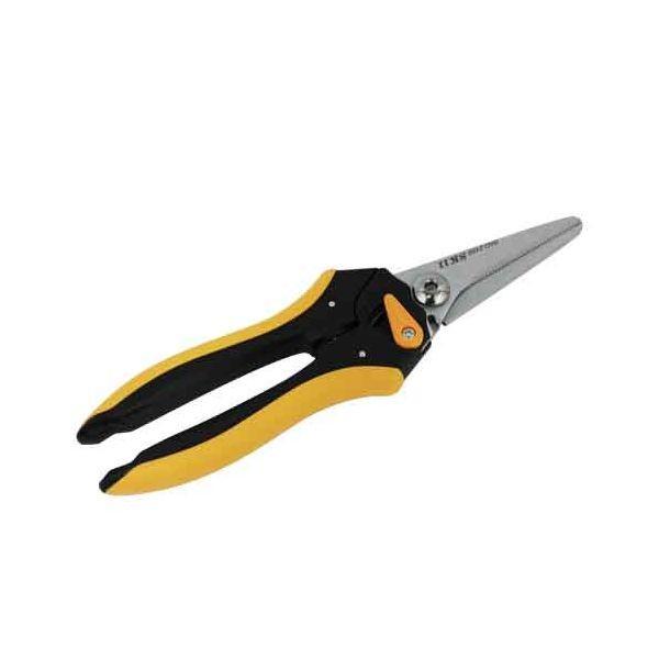 【用途】ブリキ・アルミ・プラスチックなどの切断。【機能・特徴】手の大きさや作業に合わせて、グリップの開き幅を2段階に調整できます。セレーション刃が切るものを逃さずスムーズにカットできます。すべりにくいラバー付、作業が楽なバネ付グリップです。切れ味の良いハイカーボンスチール刃に、サビにくいハードクロームメッキを施しています。【仕様】●切断目安:(アルミ板)1.0mm・(銅板)0.5mm・(トタン、ブリキ板)0.5mm・(プラ板)1.2mm。●切断目安:(皮革・ゴム板)4.0mm。●切断目大工道具 金切鋏カッター 万能鋏