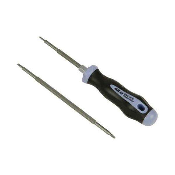 【用途】三角ネジの締付け、緩め作業。【機能・特徴】エラストマー樹脂グリップ採用で、滑りにくく力が掛けやすいです。玩具や景品にある三角ネジに使用できます。【仕様】●付属ビット数:二本。●専用マスターハンドル付。●グリップ:ラストマー樹脂。●セット内容:全長150mmビット(六角対辺5mm)2.0mm×2.2mm・1.6mm×2.3mm・専用マスターハンドル。【注意事項ほか】電気が流れているものには、使用しないで下さい。サイズに合ったものを使用して下さい。作業時には保護メガネを着用し作業工具 ドライバー六角棒レンチ 特殊ドライバー