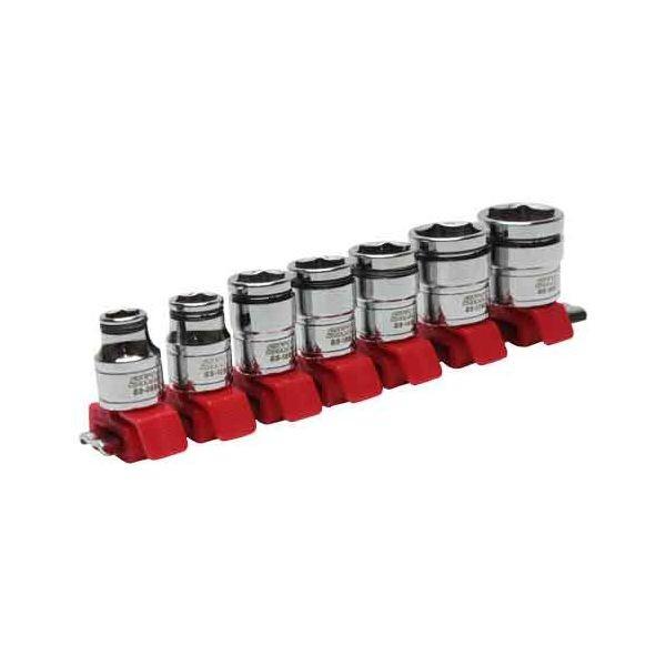 【用途】六角ボルト・ナットの締付け、緩め作業。【機能・特徴】片手作業もスムーズで、奥まった場所での作業に便利です。新型ソケットホルダーを採用しました。ワンタッチ操作で、簡単にソケットを取外せ、確実にソケットを取付けられます。六角ボルト(ミリ)に対応します。【仕様】●差込角:9.5mm(3/8インチ)。●サイズ内容:8・10・12・13・14・17・19mm。●ソケットホルダー付。●クリップ色:赤。●ソケット:クロームバナジウム鋼。●ソケットホルダークリップ:ポリアセタール。●レ作業工具 ソケット ソケットレンチセット