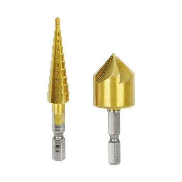 【用途】薄鉄板・アルミ等の穴あけ・穴拡大・バリ取り、薄鉄板・アルミ・プラ等の穴あけ後のバリ取り・面とり作業。【機能・特徴】ステップドリルは、独自の刃先角度設計により切削抵抗を軽減し、バッテリー効率が良く充電インパクトドライバーでの使用に最適です。ステップドリルは、刃先シンニング加工により、材料への食いつきが良くセンターポンチが不要です。ステップドリルは、チタンコーティング仕様により耐熱性に優れ、長寿命です。フリードリルはハイス鋼とチタンコーティング仕様のため、耐久性に優れています。フリードリ先端工具 鉄工アクセサリ 鉄工穴あけ