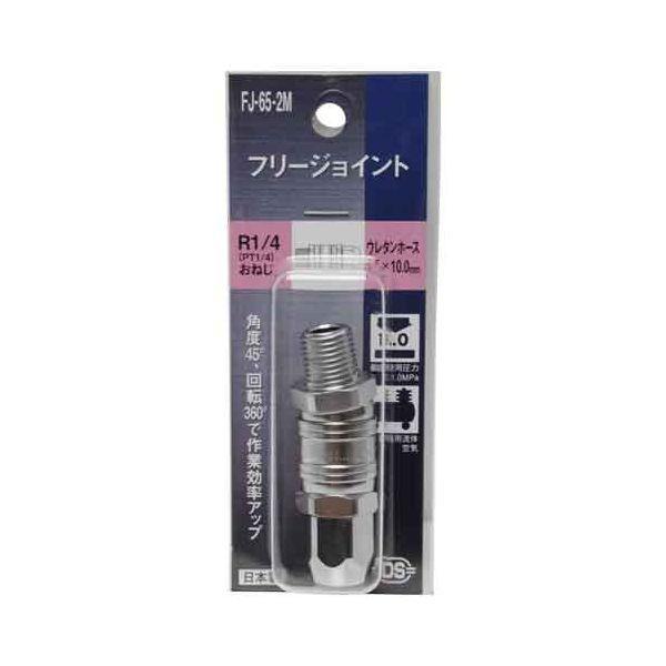 【用途】エアー配管継手(フリージョイント)。【機能・特徴】作業時の手首への屈折疲労負担を軽減します。45度屈曲でホースの折れを解消します。360度回転するのでホースのねじれを解消します。中継や元配管でのホース負担を軽減します。作業時のホースへの屈折疲労負担を軽減します。【仕様】●接続ねじ:おねじR1/4。●適用流体:空気。●最高使用圧力:1.5MPa。●使用温度範囲:-5~60度。●全長:62mm。●ウレタンホース口:(内径)6.5~7.0mm・(外径)10.0mm。●本体:電動工具 エアーツール 配管継ぎ手ねじ
