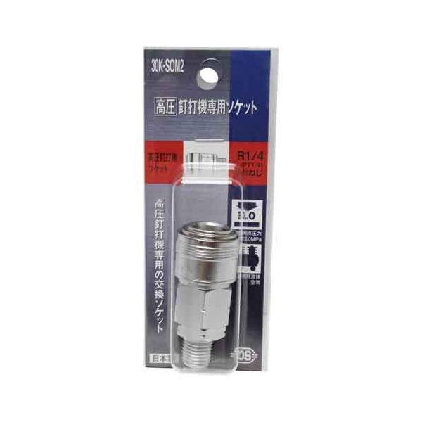 【用途】エアー配管継手。【機能・特徴】高圧釘打機専用ソケットです。【仕様】●サイズ:R(PT)1/4おねじ。●最高圧力:3.0MPa。●適用流体:空気。電動工具 エアーツール 建築用工具高圧機器
