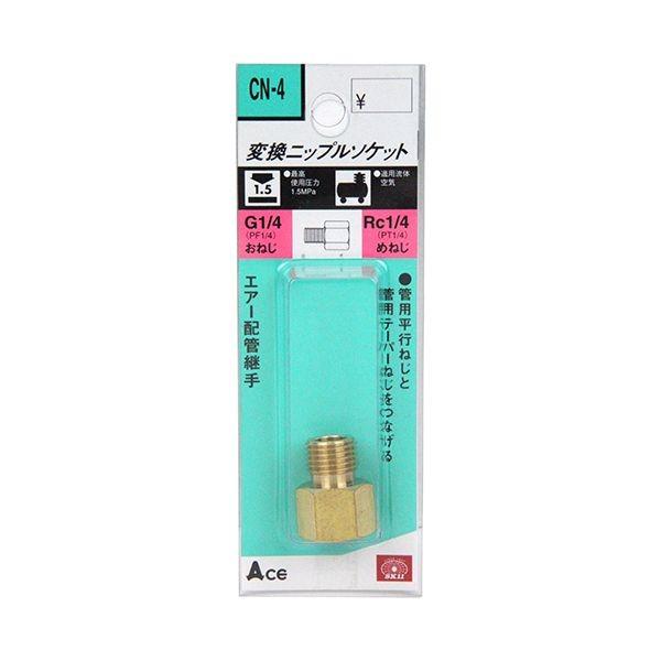 【用途】エアー配管継手(変換ニップルソケット)。【機能・特徴】管用平行ねじと管用テーパーねじをつなげることが出来ます。【仕様】●接続ねじ:おねじG(PF)1/4・めねじRc(PT)1/4。●適用流体:空気。●最高使用圧力:1.5MPa。●真鍮。電動工具 エアーツール 配管継ぎ手ねじ