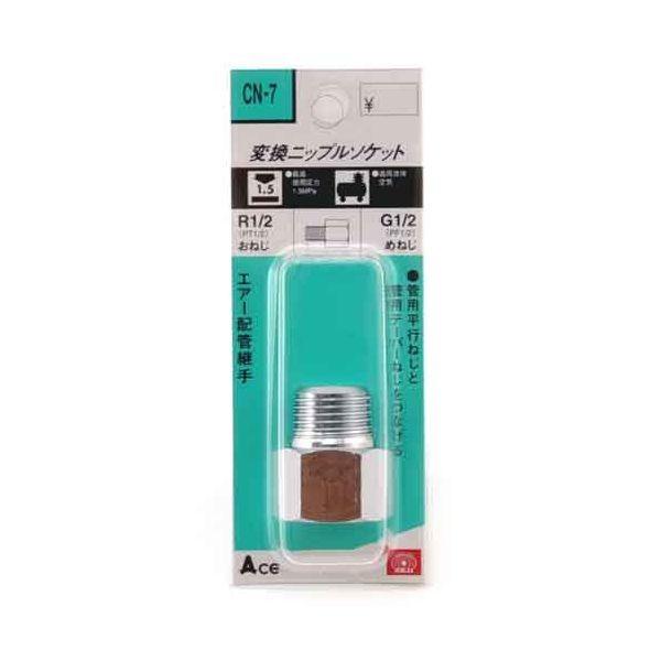 【用途】エアー配管継手(変換ニップルソケット)。【機能・特徴】管用平行ねじと管用テーパーねじをつなげることが出来ます。【仕様】●接続ねじ:おねじR(PT)1/2・めねじG(PF)1/2。●適用流体:空気。●最高使用圧力:1.5MPa。●真鍮。電動工具 エアーツール 配管継ぎ手ねじ