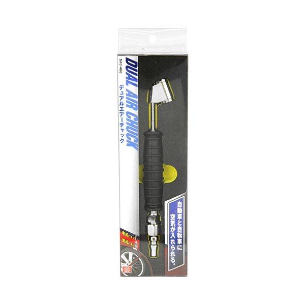 【用途】エアーコンプレッサーからの圧縮空気をタイヤに注入するタイヤチャック。【機能・特徴】英式バルブ・米式バルブに適合するデュアルチャックで、自動車と自転車に空気が入れられます。ワンタッチ汎用プラグ付きなので市販のエアホースセットに簡単に接続ができます。プラグを外せばG1/4おねじになり、市販のホースジョイントでホースを直接つなげることも出来ます。グリップ付きで握りやすく、冬場でも冷たくありません。ダブルヘッドでトラックなどのダブルタイヤにも注入しやすいです。【仕様】●最高使用圧力:1.電動工具 エアーツール タイヤチャックゲージ