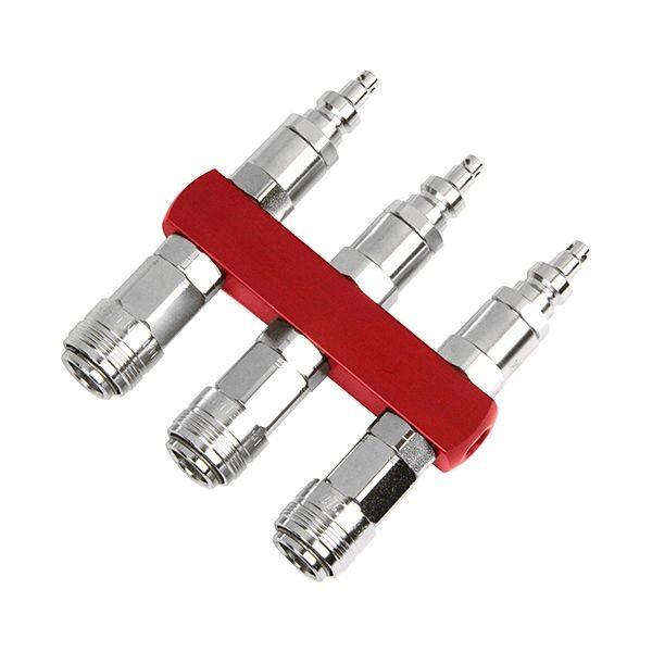 【用途】建築用高圧コンプレッサー連結効率化継ぎ手。【機能・特徴】3台の高圧エアコンプレッサーからのホースを連結・分岐し作業効率をアップします。市販の建築用高圧機器のソケットとプラグが接続できます。プラグ側には逆止弁が内蔵してありますので接続しなくてもエアーは漏れません。2台または3台の建築用高圧エアコンプレッサーのエアーを取出し後に連結分岐し、1台から3台の釘打機に効率よく供給します。1台のコンプレッサーに対し1台の釘打機を使用するよりもエアーコンプレッサー2台または3台を使用する方が空気供電動工具 エアーツール 建築用工具高圧機器
