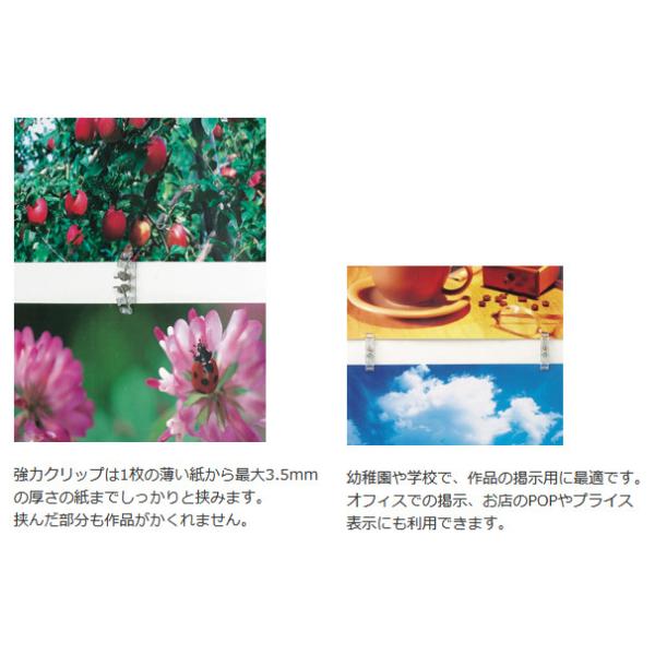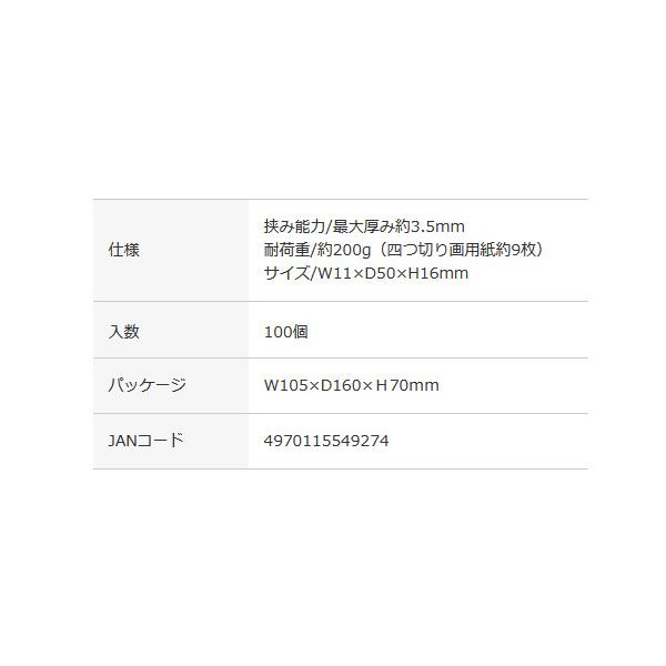 ●学校の作品掲示や、オフィス/お店のPOP表示に便利です。強力クリップは1枚の薄い紙から最大3.5mmの厚さの紙までしっかり挟みます●入数:100個●耐荷重約200g(四つ切画用紙約9枚)●本体:再生PC●W11XD50XH16mm