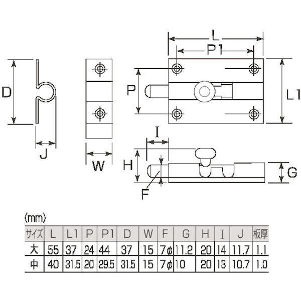 【特長】●取り付けの適応範囲が広い商品です。●操作が簡単です。【用途】●木製扉や家具の簡易戸締りに。【仕様】●L(mm):55●B(mm):37.0●C1(mm):44.0●C(mm):24●本体長さ(mm):55●本体幅(mm):37.0●ラッチ径(mm):7φ●板厚(mm):1.1【材質/仕上】●ステンレス(SUS304)●表面仕上:化学研磨【セット内容/付属品】●ステン皿木ネジ(2.7×16)【原産国】日本