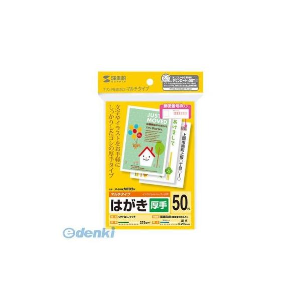 サンワサプライメーカーお問い合わせ:03-5763-0011【商品説明】●インクジェットプリンタ、レーザープリンタなどプリンタを選ばず使えるマルチタイプのはがき。文字やイラスト中心のお手軽印刷に最適。●しっかり厚手タイプ。●年賀状はもちろん、季節のご挨拶や、転居のお知らせ、DMなど幅広い用途に。●宛名面には郵便番号枠の印刷があります。●サイズ:ハガキ(100×148mm)●入り数:50シート●重量:233g/m2●厚み:0.255mm●白色度:92%以上●対応プリンタ:インクジェットプリンタ(エプソン 顔料系インクにも対応)、カラーレーザープリンタ・モノクロレーザープリンタ、カラーコピー、モノクロコピー、熱転写プリンタ●インクリボン使用時
