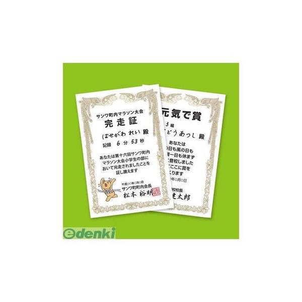 サンワサプライメーカーお問い合わせ:03-5763-0011【商品説明】●オリジナル賞状が簡単にできる便利な用紙。必要なときに必要な数だけ作成できます。●表面には、あらかじめ豪華な賞状の枠が金色で印刷してあるので、文章を追加して印刷するだけでオリジナル賞状ができあがります。●学校や幼稚園、保育所、町内会のイベントなどでのちょっとした表彰に便利です。●サイズ:はがきサイズ(100×148mm)●仕様:縦書き用賞状●入り数:20枚●重量:186.1g/m2●厚み:0.202±0.01mm