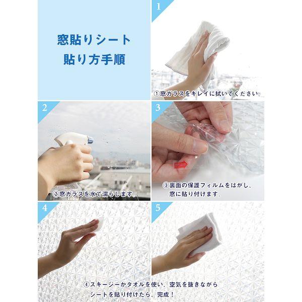 【商品説明】サイズ46cm丈x90cm品質塩化ビニール樹脂100% 保護フィルム(ポリエステル100%)粘着剤を使っていないので、貼って、はがせて、また貼れます。ペアガラス・網入りガラスにも貼れます。フィルムを貼るだけで本物のガラス模様を加工したような表現で光を取り込みキラキラ輝きます。目隠し効果があり、視線が気になる窓に最適です。UV(紫外線)99%カット配合ですので、畳やジュータンなどを日焼けによる変色から守ります。※ご使用いただけないガラスもあります。商品説明図をご参考ください。