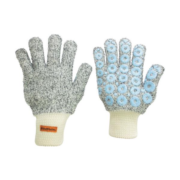 ミドリ安全メーカーお問い合わせ:048-989-3177【特長】●アラミド繊維と独自開発のループ構造により、手袋の中に空気層を作り熱を通しにくくしています。●(公財)日本防炎協会の認定(第KO-12-003号)を初めて受けた手袋です。●シリコンゴムすべり止め付きです。●熱さを感じた際には、手を叩く動作を行い、中の空気を入れ替えるとすぐに熱さがやわらぎます。●柔らかな素材でできており、指が自由に動かせます。●繰り返し洗濯が可能で経済的です。【用途】●溶接作業、高温作業現場に。【仕様】●サイズ:フリー●厚さ(mm):3.5●全長(cm):26.0●手のひら周り(cm):26.0●中指長さ(cm):8.0●すべり止め:あり【仕様2】●7ゲージシームレス編●素材耐熱温度:370℃【材質/仕上】●メタ系アラミド繊維95%、難燃性ポリエステル●すべり止め部:シリコンゴム【原産国】日本
