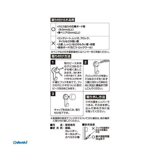 【商品説明】●専用クギ打ちプッシュマジック付き!●初めての方でも安心!●クギがクロスして、石膏ボード壁に強力固定!●抜き跡が目立たない!●壁面専用。使用例:額縁、カレンダー、キーホルダー、カベカケ小物●取付けられる場所:クロス貼りの石膏ボード壁(9.5mm以上)、薄ベニヤ(5mm以上)●●ベニヤなどの木質新建材にはハンマーをご用意ください。●色:ニッケルメッキ●材質:フック(本体:鉄、キャップ:ポリエチレン、取付ピース:ABS樹脂、クギ:ステンレス)、プッシュマジック(本体:ポリアセタール樹脂、芯:鉄