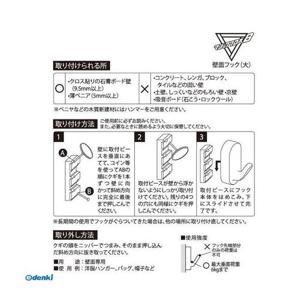 【商品説明】●壁にマッチするプラフック!●クギがクロスして、石膏ボード壁に強力固定!●抜き跡が目立たない!●コイン等で取付け簡単!●壁面専用。使用例:洋服ハンガー、バック、帽子など●取付けられる場所:クロス貼りの石膏ボード壁(9.5mm以上)、薄ベニヤ(5mm以上)●●ベニヤなどの木質新建材にはハンマーをご用意ください。●●石膏ボード壁の取り付けには、専用工具(プッシュマジック、クギ押しくん)もございます。●耐荷重:6kg●色:ホワイト●材質:本体・取付ピース:ABS樹脂、クギ:ステンレス