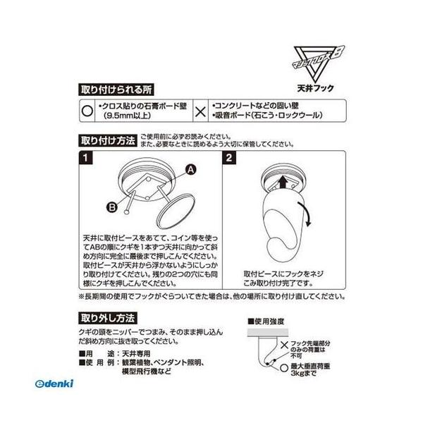 【商品説明】●天井にマッチするプラフック!●クギがクロスして、石膏ボードの天井に強力固定!●抜き跡が目立たない!●コイン等で取付け簡単!●天井専用●取付けられる場所:クロス貼りの石膏ボード壁(9.5mm以上)●耐荷重:3kg●色:ホワイト●材質:本体・取付ピース:ABS樹脂、クギ:ステンレス
